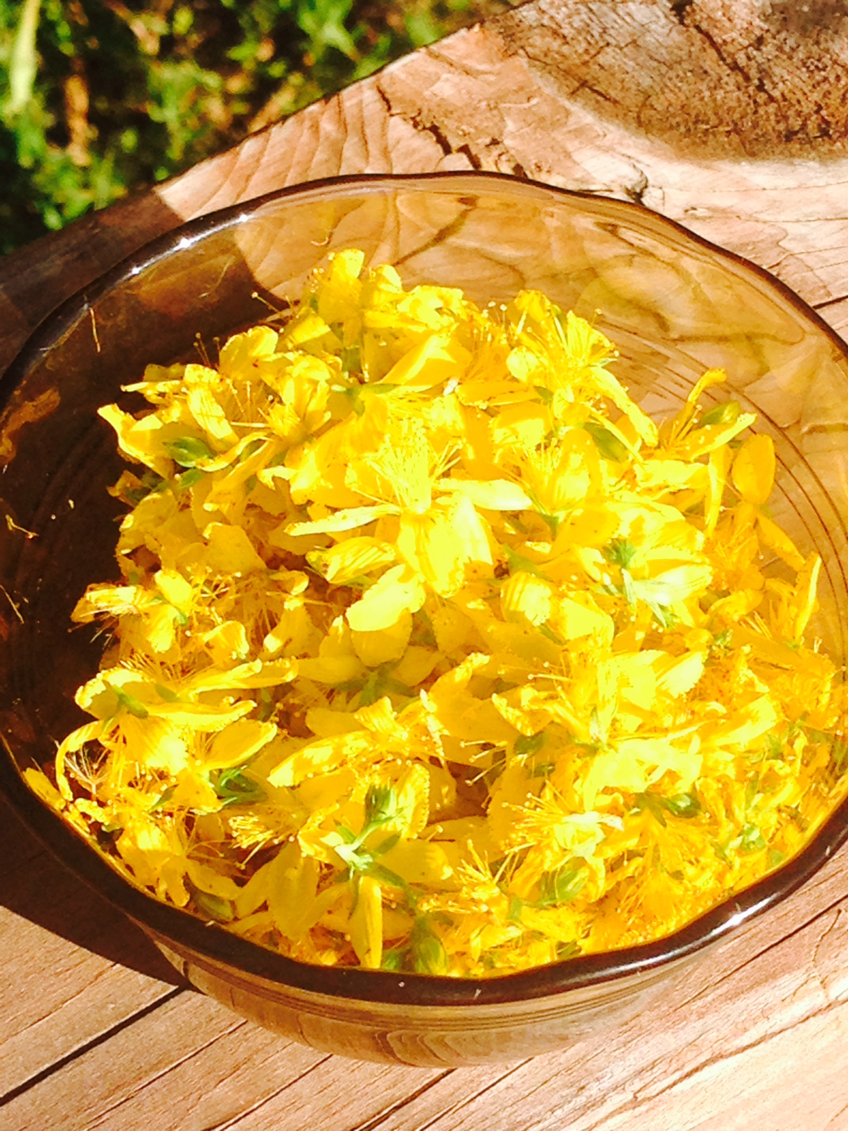 FullSizeRender(7)Harvest the blossoms (or flowering tops) of St John’s Wort and let them wilt for 6-24 hours. This allows some of the moisture to evaporate as well as any critters hiding in the petals to leave…