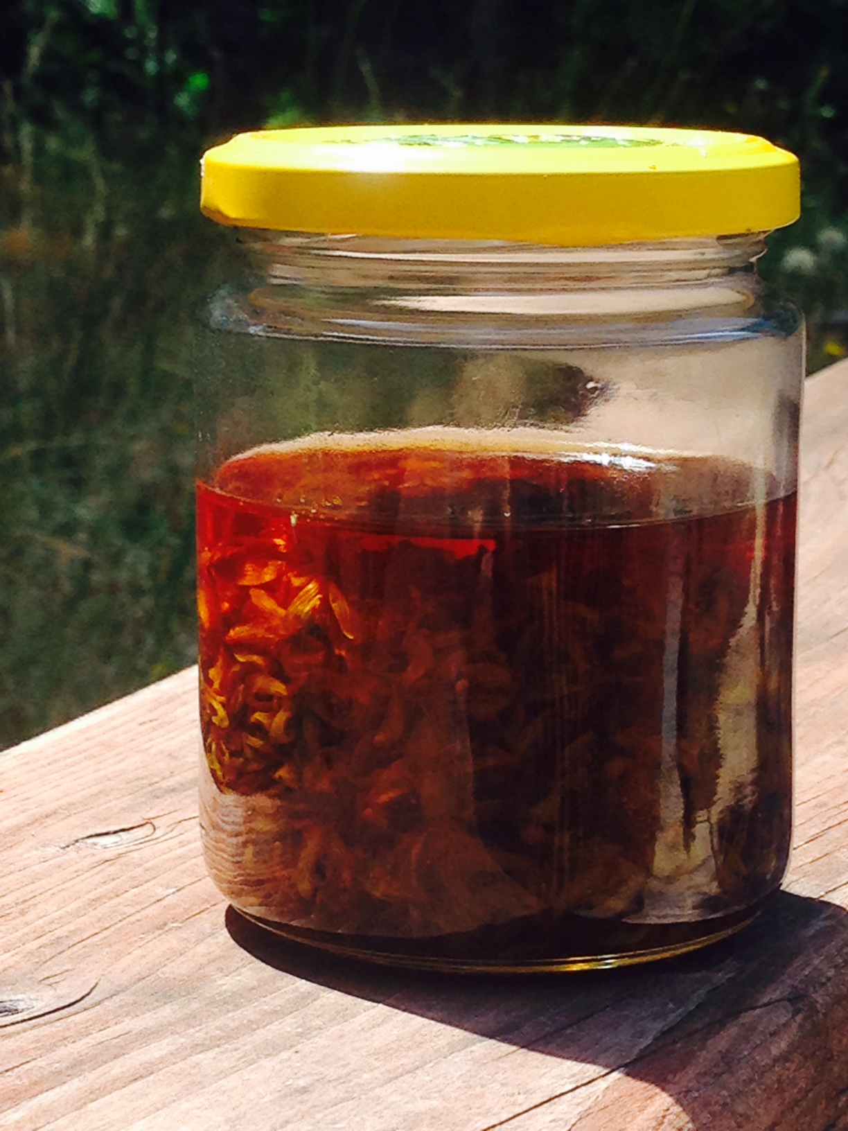FullSizeRender(9)Your oil will quickly turn blood red from the medicinal constituents of the herb infusing into the oil. After  a month, you can strain out the herb and use the medicinal oil that is the result!