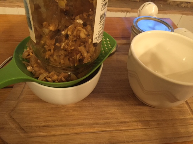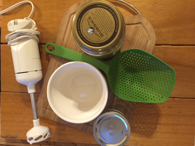 IMG_0692You will need to gather your equipment: a hand blender, a strainer, a couple of bowls and your jar of Fire Cider.